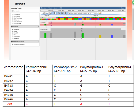 在分别转化对应甘薯栽培种品系后,为验证基因编辑效率,故对转基因株系进行了分析。研究人员提取了转基因株系的基因组,首先通过Cas9基因扩增,验证株系的阳性与否。同时在在目的靶点上下游分别设计PCR扩增引物进行扩增,根据条带大小初步判定编辑效果:单带:可能发生点突变、移码突变或无突变;双带(一大一小):可能发生了大片段删除。分别回收对应PCR产物进行测序,对测序结果分析表明,CRISPR / Cas9系统在甘薯基因组中达到良好的基因编辑效果,突变率达到了63%以上(Table 1)。,在单靶体系和双靶体系中均发现了多种形式的编辑结果,如替换、插入突变、删除突变;在双靶体系中同时也检测到了大片段删除,最长可删除2658bp(图2,图3)。因为甘薯是异源六倍体,理论上存在六条独立染色体,为了弄清基因编辑的具体位置和效率,研究者又进一步对编辑位点进行了定位,通过多态位点分析,可以精确定位到编辑位点位于第几号染色体上(图4)。