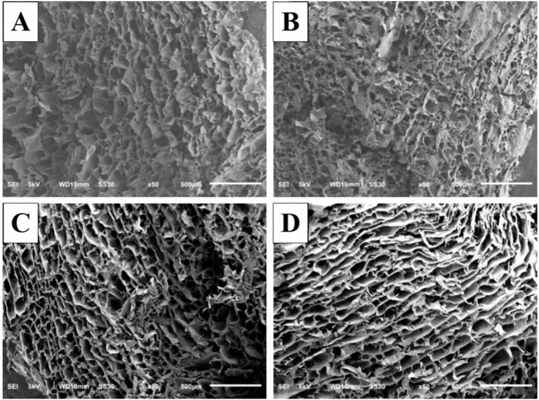 扫描电镜可用于获得样品的形态和表面特征的详细信息。所有样品的表面都呈现出三维网状结构,糊化导致淀粉颗粒全部破碎,孔隙稀疏且分布不均匀,结构松散(图5A)。