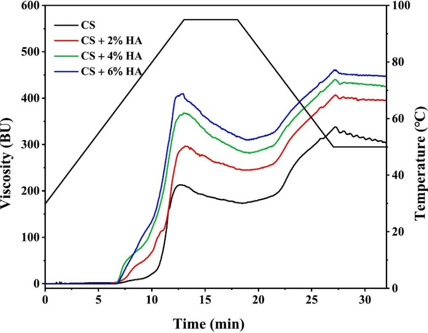 在CS-HA混合物中,随着HA加入浓度的升高,峰值粘度增加,回生值降低等。表明透明质酸的加入显著提高了玉米淀粉的粘度。这可能是因为淀粉和水胶体之间的相互作用增加了粘性,其次透明质酸富含羧基,在溶液中呈半刚性链构象,进一步增强了其特殊的增稠性能。