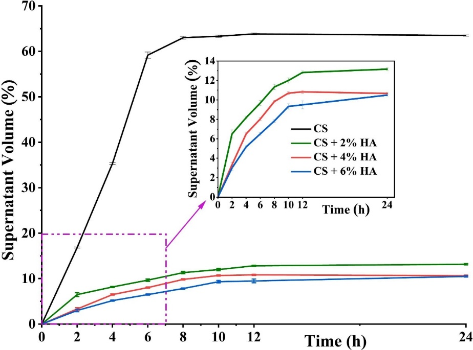 CS的上清液体积在沉淀的前8小时迅速增加。这表明CS更容易回生(易变质),因此CS不适合作为食品稳定剂。但8小时后,随着HA浓度的增加,再生速率降低。这一结果可能是因为透明质酸的强保水性和增稠性。HA可以在糊化过程中与浸出的直链淀粉形成氢键,阻碍回生。其次,透明质酸的高增稠作用稀释了淀粉链,并增加了周围介质的粘度,抑制了淀粉链的运动,阻碍了淀粉的再生过程。