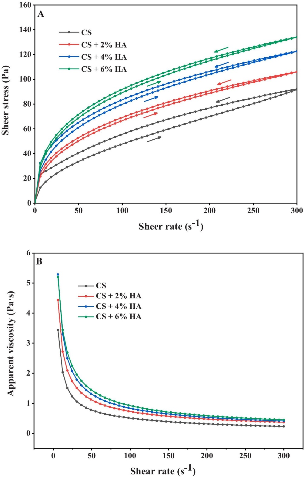 图3 CS和CS-HA混合物的稳定剪切流动曲线(A)和表观粘度(B)