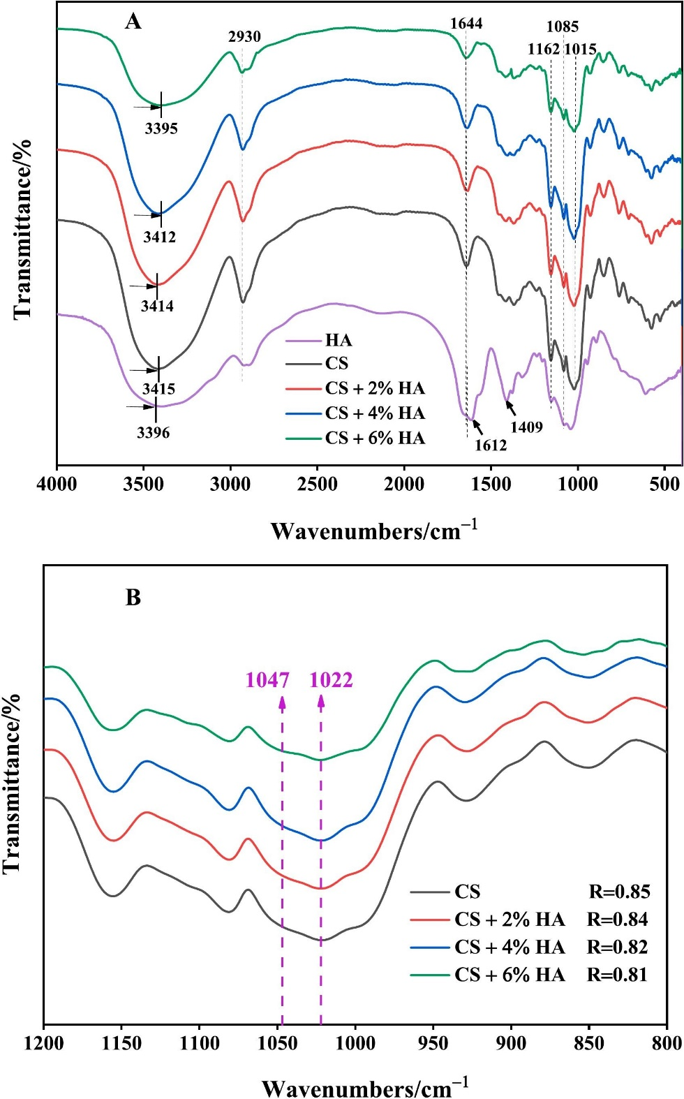 CS、HA和CS-HA的吸收峰大体一致,并且在CS-HA混合物中没有检测到明显的新吸收峰,表明CS和HA之间没有新的共价键。在CS中加入HA后,在3400 cm-1、2930 cm-1和1644 cm-1处的吸收峰强度降低。这表明淀粉和透明质酸分子之间的缠结增加,导致混合物中分子间相互作用增强。