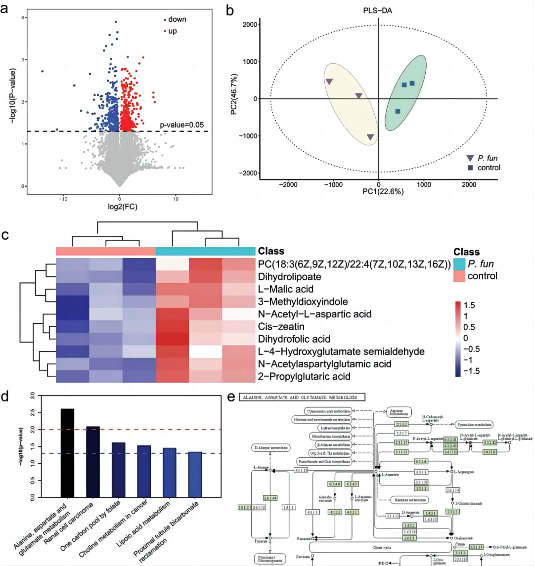 作者收集了小鼠移植肿瘤的样本进行了代谢组分析,结果显示共有380种差异代谢物,且两组肿瘤样本的全局代谢可以显著区分。实验组中,上调最明显的代谢物是2-丙基戊二酸(脂肪酸类,可能与药物代谢有关)和N-乙酰天冬氨酸谷氨酸(氨基酸、肽及其类似物),全局差异代谢物主要富集在丙氨酸、天冬氨酸和谷氨酸代谢途径中(图8a-e)。