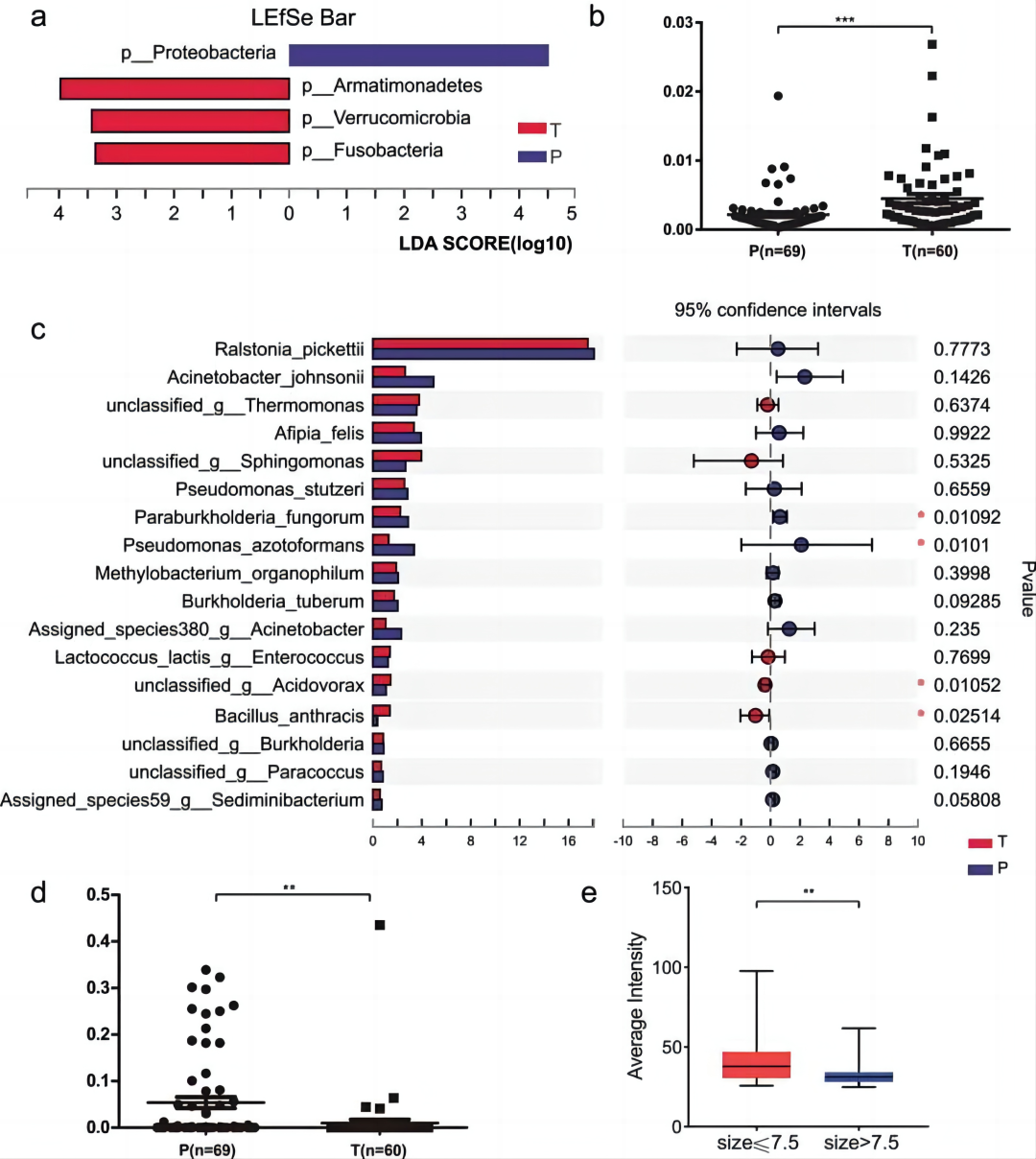 作者引入了阴性对照消除污染,分析后发现肿瘤组织和癌旁组织之间的微生物构成整体相似(图1a),从组成多样性上看,ICC肿瘤组织中的微生物种类更多,且其α多样性显著高于癌旁组织(图1b-c)。而在β多样性分析中,三组样本存在显著差异,不过相对于正常组,P组和T组之间也有很大的相似性(图 1d)。由于所选的正常组织来自肠癌肝转移或肝血管瘤患者,病理背景差异大,后续分析中不纳入。