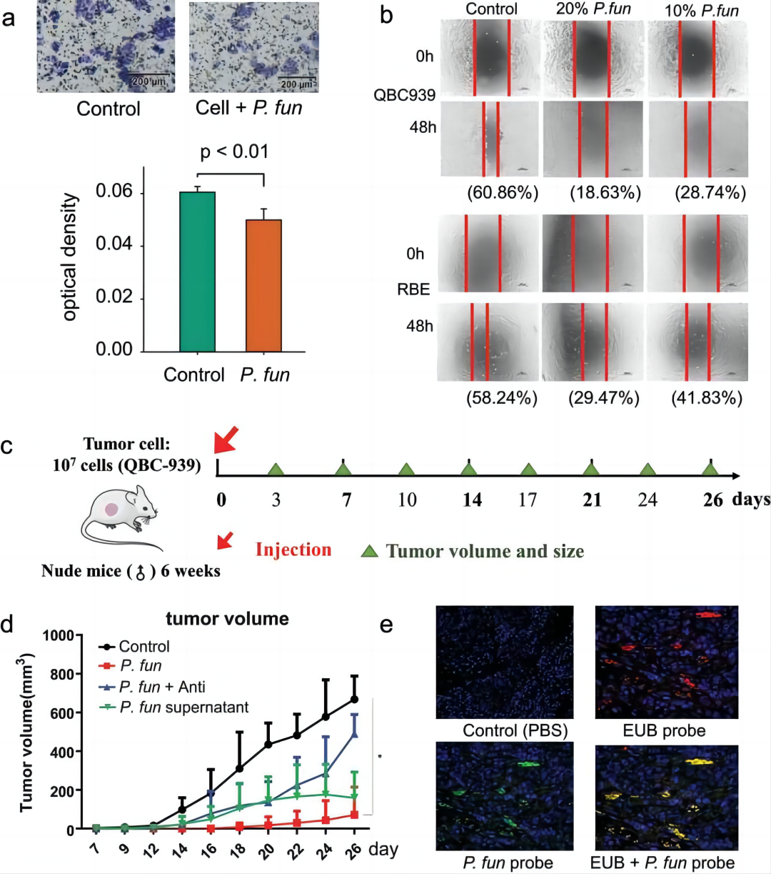 为了验证上述细菌的功能,作者研究了P. fungorum对人类胆管癌细胞系RBE和QBC939的影响。透孔试验结果显示,加入真菌上清液后,电镜下单位面积的细胞数明显减少,表明细胞的增殖和迁移能力减弱(图7a),划痕实验中愈合率也随着细菌上清液浓度的逐渐增加而降低(图7b)。