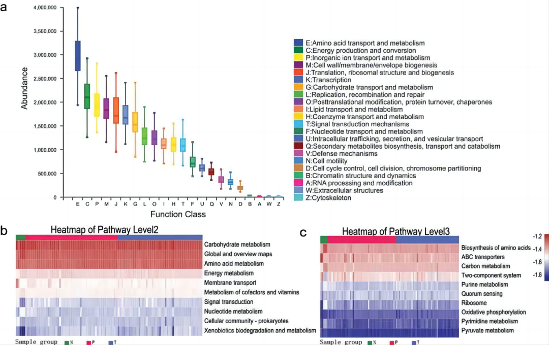 通过eggNOG预测,作者发现这些细菌的功能主要涉及新陈代谢,且氨基酸代谢相对丰度最高(图5a),KEGG分析结果表明,细菌的菌落功能主要与氨基酸和核苷酸代谢碳水化合物的途径有关(图5b),level 3的KEGG结果进一步显示,细菌与氨基酸的生物合成、嘌呤代谢、嘧啶代谢和丙酮酸代谢有关(图5c)。