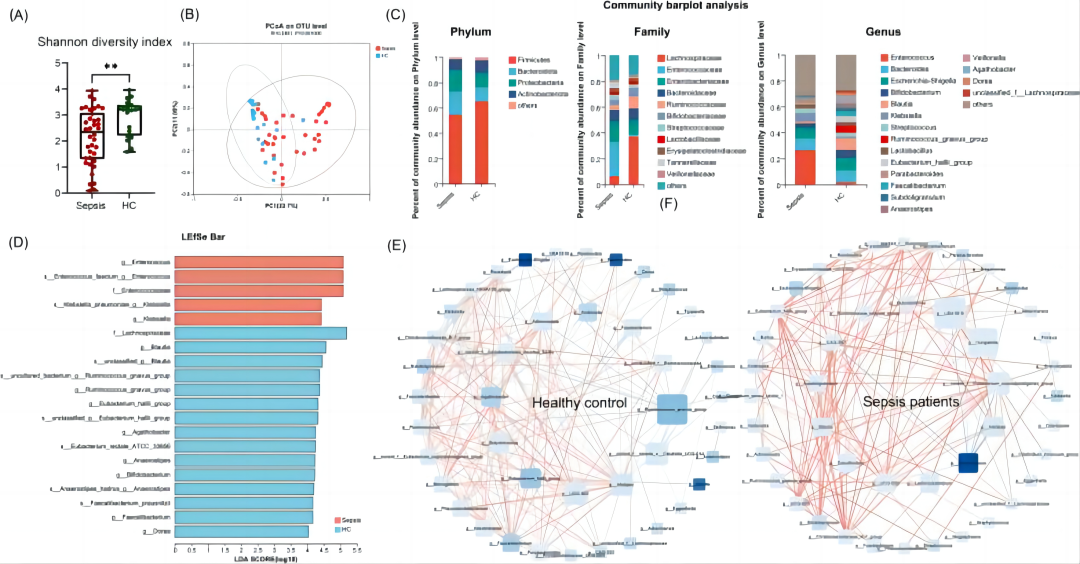 作者首先比较了脓毒症患者和健康对照(HC)之间的微生物多样性,结果表明,脓毒症组的α多样性明显低于HC组,群落结构也有差异,脓毒症患者中变形菌门和肠球菌科的比例有所上升,但固着菌门和漆树菌科的比例显著下降,LefSe分析表明,脓毒症患者体内促进健康的菌群明显减少(图1A-D)。此外,关联网络结果显示,脓毒症患者的细菌间关系网络相对简单,且肠球菌对其他类群表现出特殊的抑制作用(图1E)。