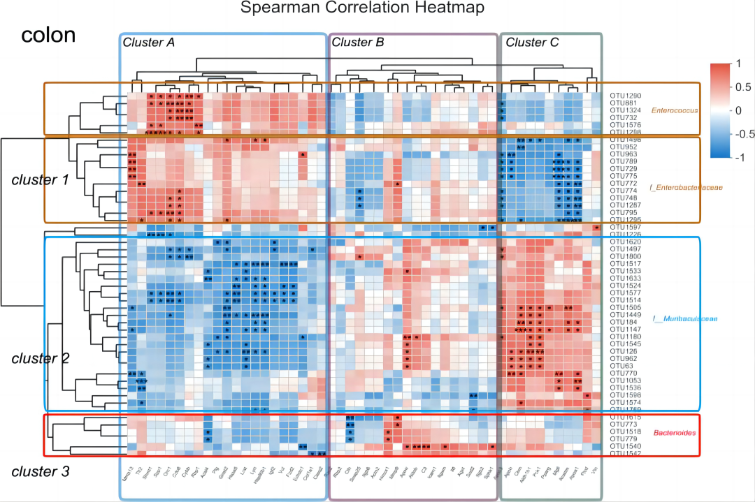 作者随后对微生物丰度和肠道基因表达进行了相关分析,以确定肠道微生物在脓毒症病理生理学中的潜在作用。结肠的分析结果如图5所示,可以分为三个细菌群(簇1-3)和三个基因群(簇A-C)。簇1主要包含肠球菌和肠杆菌科细菌,并与簇A的基因呈正相关,这些基因具有炎症反应和ECM破坏的功能。回肠的相关分析还发现了三个主要细菌群和三个基因群,簇1和簇2的组成与结肠的相似,并且与簇A 和簇B的DEGs紧密相关,但方向相反。