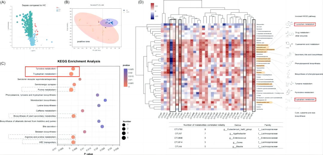 随后,作者进行了粪便样本的非靶代谢组分析,脓毒症患者与健康对组相比代谢物轮廓有明显差异,火山图显示,虽然共有449个差异物质,但脓毒症中高表达的仅有10个,表明患者的代谢活性减弱(图2A-B)。通过评估不同变量的影响,发现抗生素的影响较大。KEGG富集差异代谢物后,结果显示出色氨酸的潜在影响,差异代谢物在很大程度上参与了氨基酸代谢,包括色氨酸、酪氨酸、精氨酸和脯氨酸代谢(图2C)。考虑到肠道微生物与代谢物之间的密切联系,作者评估了菌群与代谢物之间的相关性,在排名前五的细菌中,有四种属于拉赫诺斯皮拉科,屎肠球菌与代谢物几乎呈负相关,此外,作者还确定了与细菌关系最密切的10种代谢物,其中6种是芳香族化合物,其中,参与色氨酸代谢的代谢物3-甲基二氧吲哚与微生物之间的关系最为密切(图2D)。