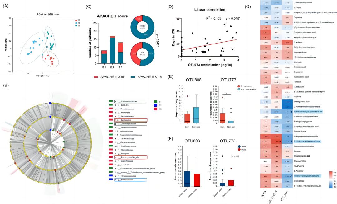 脓毒症存活患者的主要细菌类群与临床指标之间的相关性结果表明,硫杆菌的OTU773 和利剑花科的OTU822与ICU住院时长显著正相关(图3D),重症监护室期间出现并发症的患者的普通拟杆菌 OTU773载量明显较高,虽然未达到显著性差异,但数据显示,在死于脓毒症的患者中的普通拟杆菌 OTU773含量相对更高(图3E-F)。