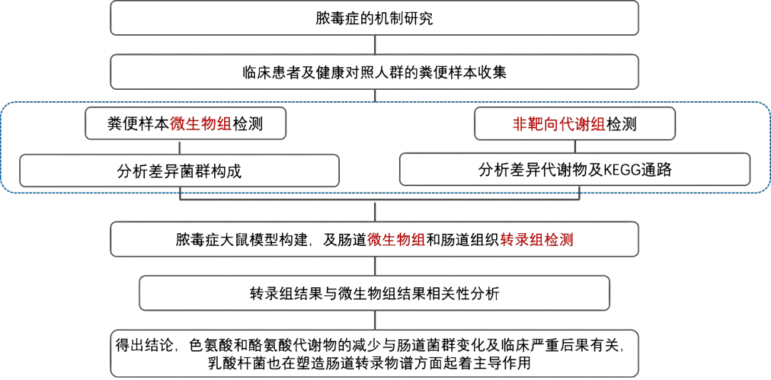 2023年上海交通大学医学院附属瑞金医院毛恩强课题组发表在Critical Care上的题为“Altered intestinal microbiome and metabolome correspond to the clinical outcome of sepsis”的文章,通过使用微生物组和代谢组学分析了临床病人的粪便样本,发现色胺酸代谢与微生物群的改变和脓毒症的严重程度密切相关。