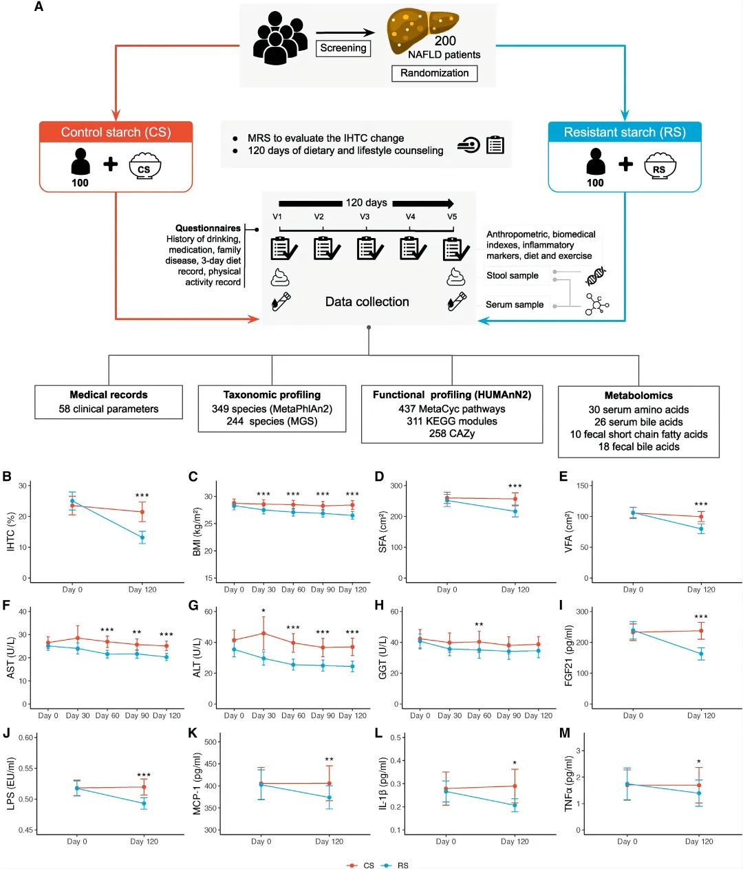 2023年11月发表在Cell metabolism上的题为“Resistant starch decreases intrahepatic triglycerides in patients with NAFLD via gut microbiome alterations”的文章,通过为期4个月的随机安慰剂对照临床试验,及宏基因组学和代谢组学的技术手段,研究了抗性淀粉(RS)作为微生物群导向膳食补充剂治疗 NAFLD 的效果,结果数据证明RS膳食补充剂可能被作为通过改变肠道微生物群组成和功能来控制 NAFLD 的策略。