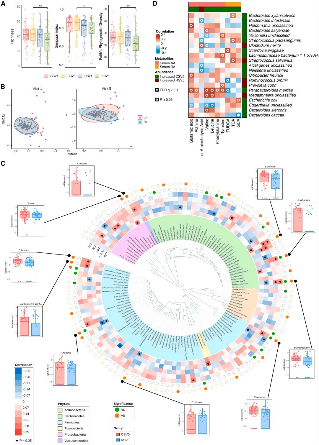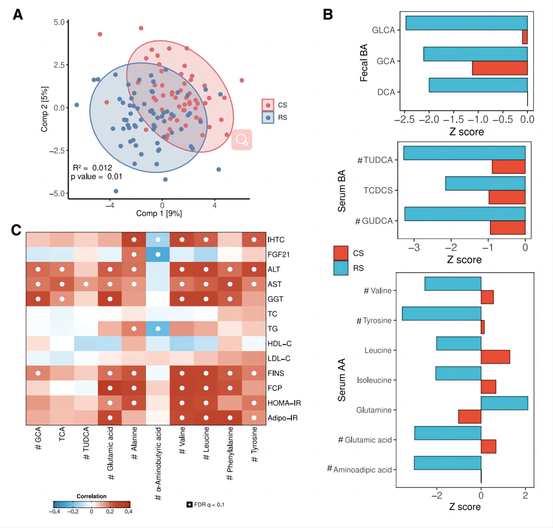 为了确认RS如何影响人类健康,作者在干预前后对RS组和CS组参与者的血清和粪便样本进行了靶向代谢组学研究,分别测定了血清中的30 种氨基酸(AA)和26种胆汁酸(BA)以及粪便中的10 种短链脂肪酸(SCFA)和 18 种BA。结果表明,在整体代谢层面上,RS和CS对物质变化有不同的影响(图2A)。在单个代谢物水平上,粪便中BA、血清中的BA和AA共有13种代谢物发生了显著变化,粪便中的SCFA无显著变化。其中,RS组中三种支链氨基酸(BCAA)(缬氨酸、亮氨酸和异亮氨酸)的血清水平都有所下降,有10种代谢物(包括缬氨酸、苯丙氨酸和α-氨基丁酸)在基线时没有差异,但在干预结束时,RS 组和 CS 组之间有明显差异。