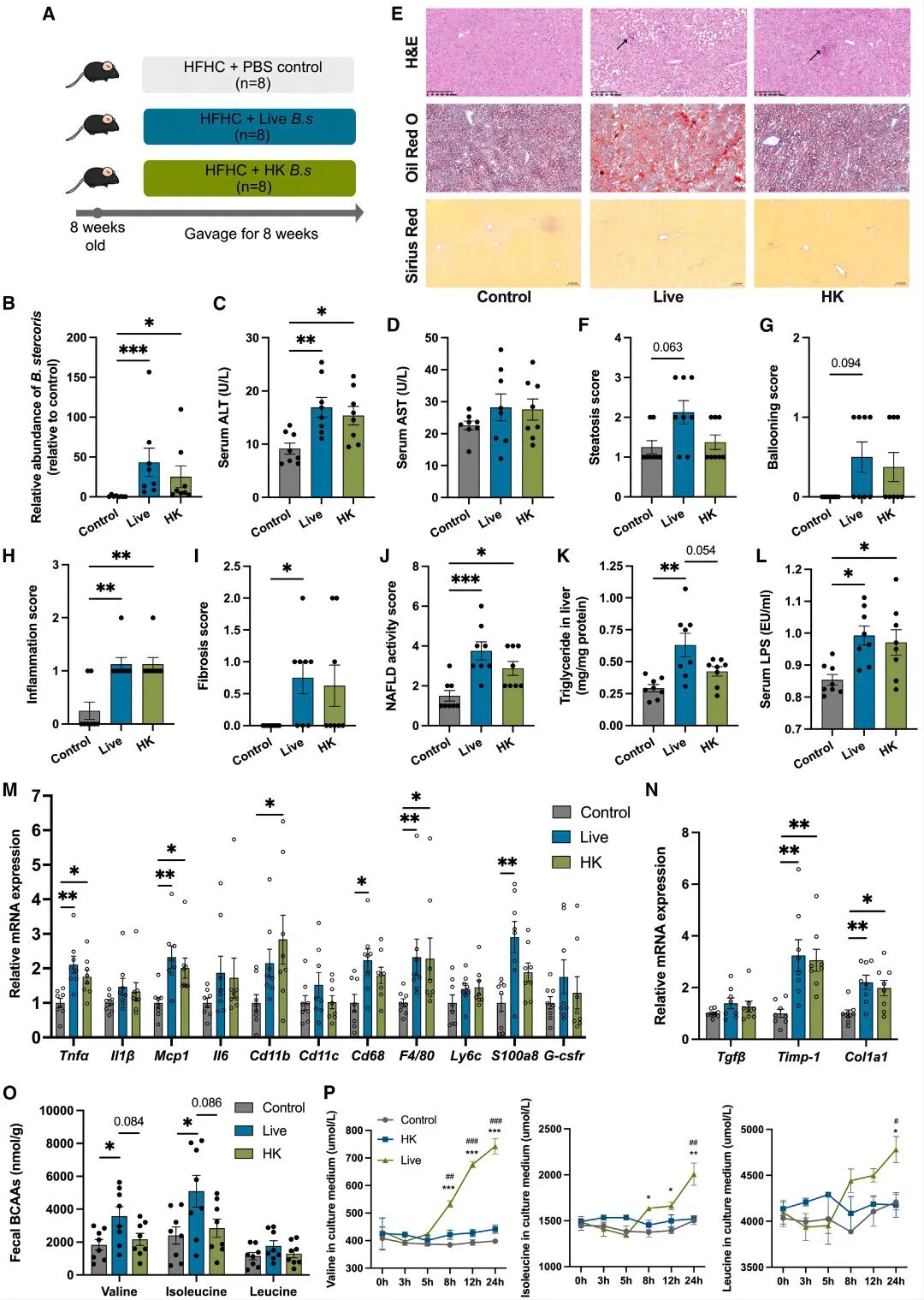 为了确定B. stercoris在分子水平上的具体影响,作者研究了肝组织中炎症和纤维化标志物的转录情况。与组织学评分相一致的是,参与促炎症反应、炎症细胞浸润和胶原蛋白形成的基因在活菌组小鼠中明显增加(图6M-N)。此外,除了活菌外,热处理后的菌也一定的效果,能对炎症产生类似的影响(图6C-M),但热处理菌组的小鼠肝脏TG含量有低于活菌组的趋势(图6K)。总之,这些研究结果表明,B. stercoris丰度的增加导致了非酒精性脂肪肝的恶化。