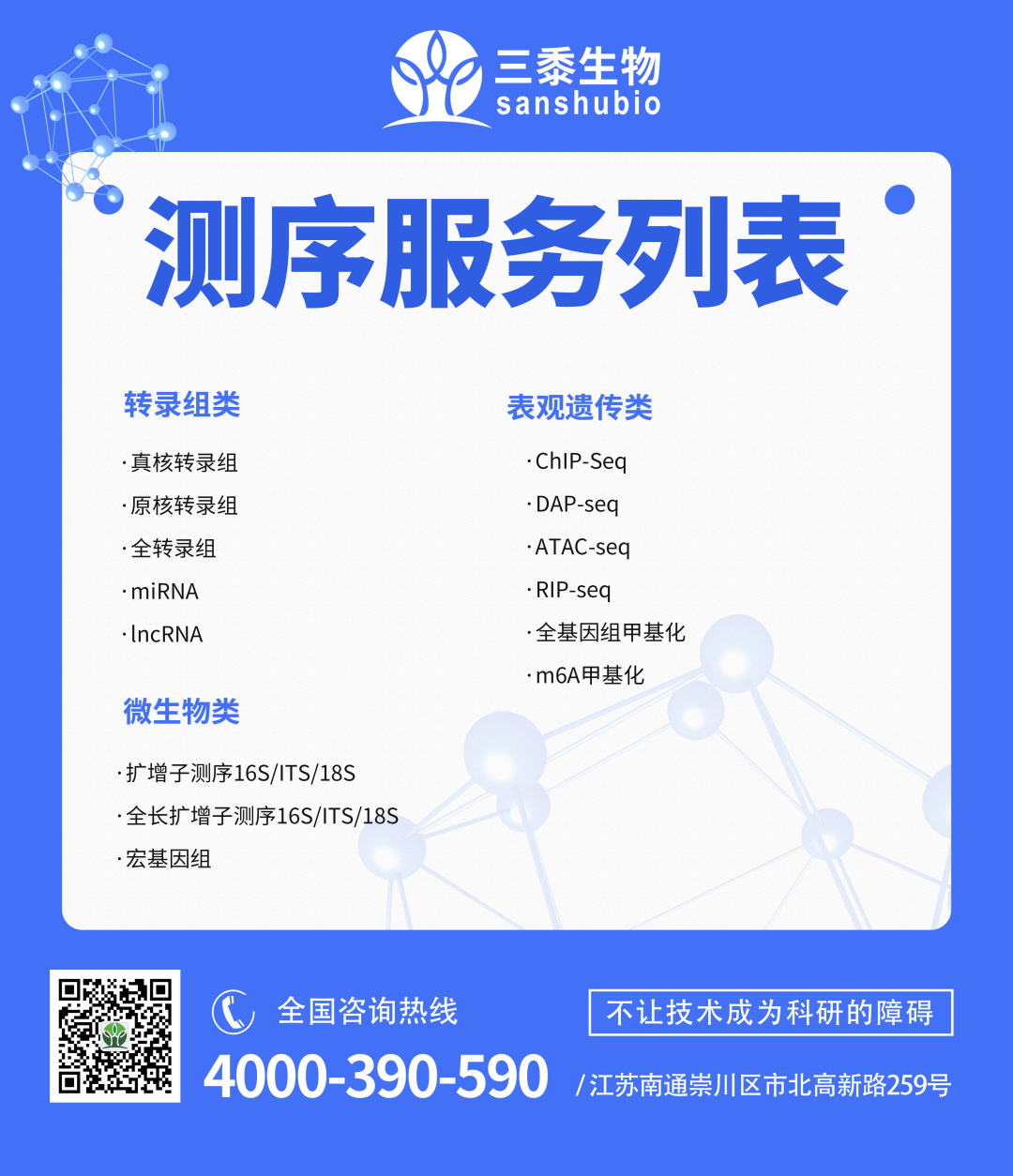 ◈三黍生物基于多年的研发和服务经验,建立了从样品提取,文库构建,上机测序,数据分析,报告出具等测序流程。具备处理复杂样本的能力、丰富的建库经验、准确地进行生物信息学分析、结合客户的需求制定个性化分析等。三黍生物为客户提供转录组测序、微生物多样性测序、基因组测序和表观遗传类测序等服务。