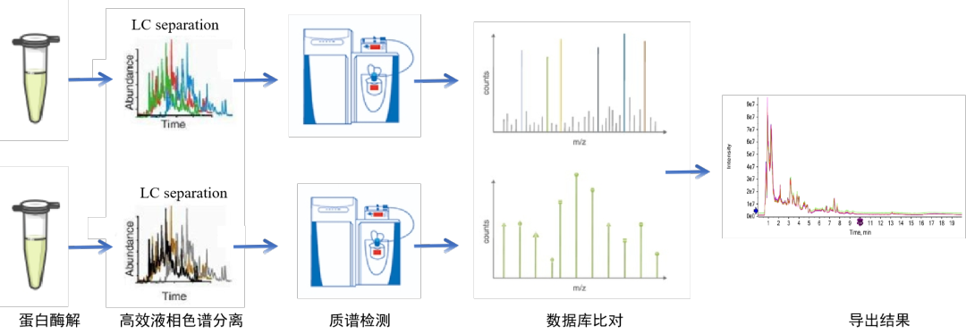 Label-free非标记定量蛋白组是一种不依赖于同位素标记的蛋白质定量技术,该技术通过液质联用对蛋白质酶解肽段进行分析,无需昂贵的稳定同位素标签做内标,只需分析大规模鉴定蛋白质时所产生的质谱数据,比较不同样本中相应肽段的信号强度,就能对相应的蛋白质进行相对定量。其基本原理是基于肽段母离子提取峰面积,先鉴定样品中的肽段及蛋白质,再对鉴定到的肽段(蛋白)进行定量分析。利用非标记定量分析多个样品之间同种蛋白质的差异。
