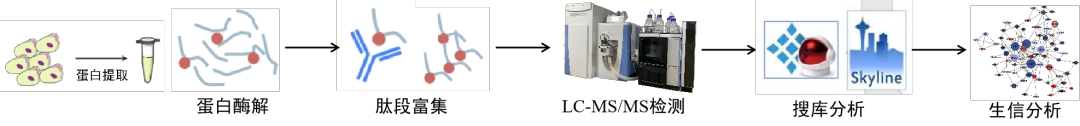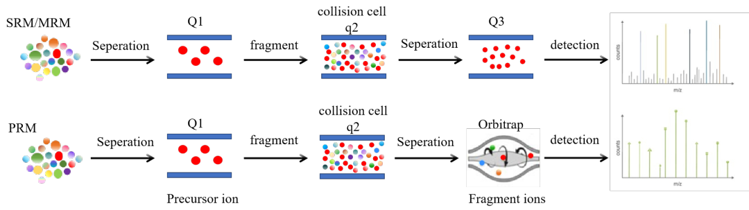 PRM(平行反应监测,Parallel Reaction Monitoring)是在多反应监测(multiple reaction monitoring, MRM)技术的基础上演化而来的,是目前靶向蛋白质组学数据采集的主流方法,根据含有目标蛋白和肽段的样品或者合成的标准肽段建立的谱图库,通过对特异性肽段或目标肽段(如发生翻译后修饰的肽段)进行选择性检测,从而实现对目标蛋白质/修饰肽段的靶向相对定量,同时可以通过合成同位素标准肽段,绘制标准曲线,实现目标蛋白质的绝对定量。PRM技术需要基于高分辨、高精度的质谱检测平台,如Q-Exactive HF-X。