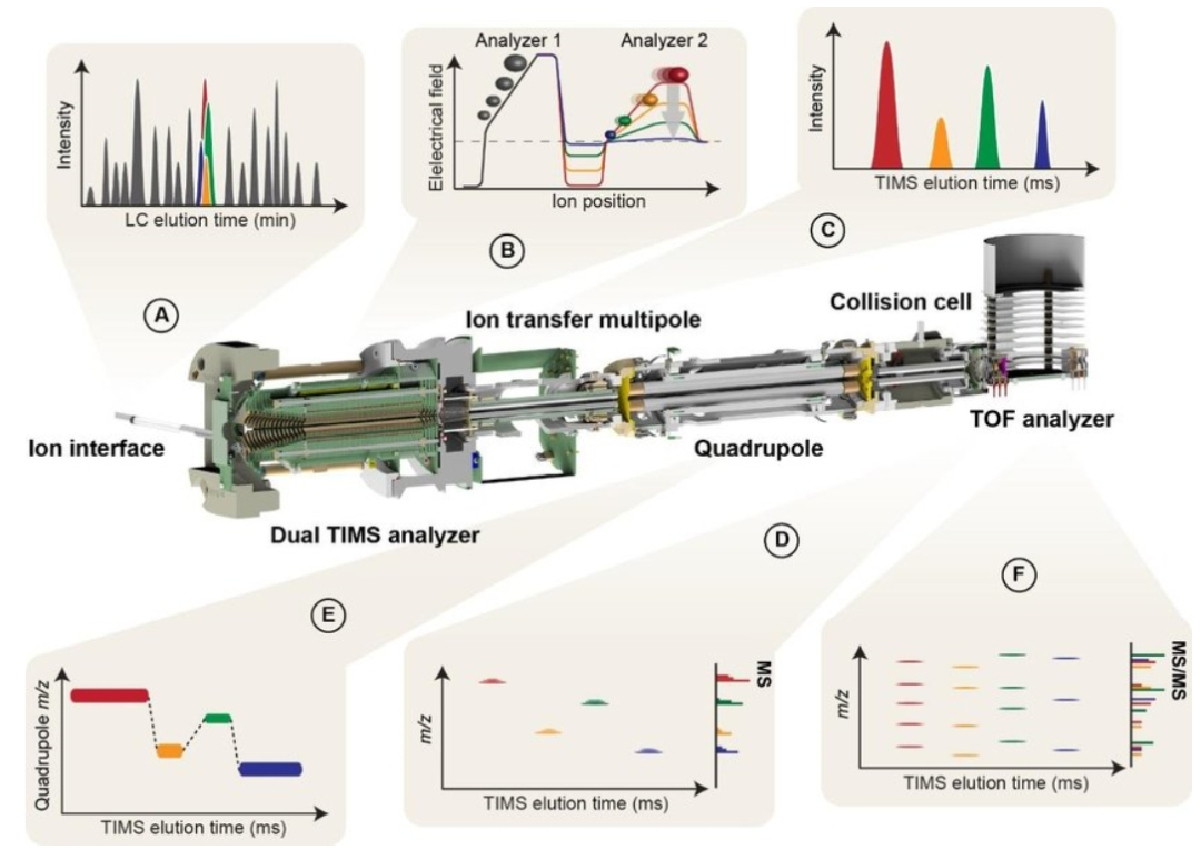 蛋白质组学质谱分析一般是根据保留时间(retention time)、质荷比(m/z)、离子强度(intensity)这三个维度对蛋白质进行鉴定和定量,即传统的3D蛋白质组学,在此基础上,4D蛋白质组学增加了第四维度-离子淌度(mobility),主要根据离子的形状和截面对离子进行分离,能够区分m/z差值非常小的肽段,使低丰度蛋白信号能够被区分和识别出来。4D蛋白质组学基于timsTOF Pro质谱仪,结合PASEF(Parallel Accumulation Serial Fragmentation,同步累积连续碎裂)与TIMS(Trapped Ion Mobility Spectrometry,离子迁移谱),可重复测量所有检测离子的碰撞截面(CCS),能更快、更灵敏的进行蛋白质组定性和定量。三黍生物提供基于timsTOF Pro的4D蛋白质组学研究服务,助力微量样本蛋白组学、大样本群医学及高通量修饰组学等研究工作。