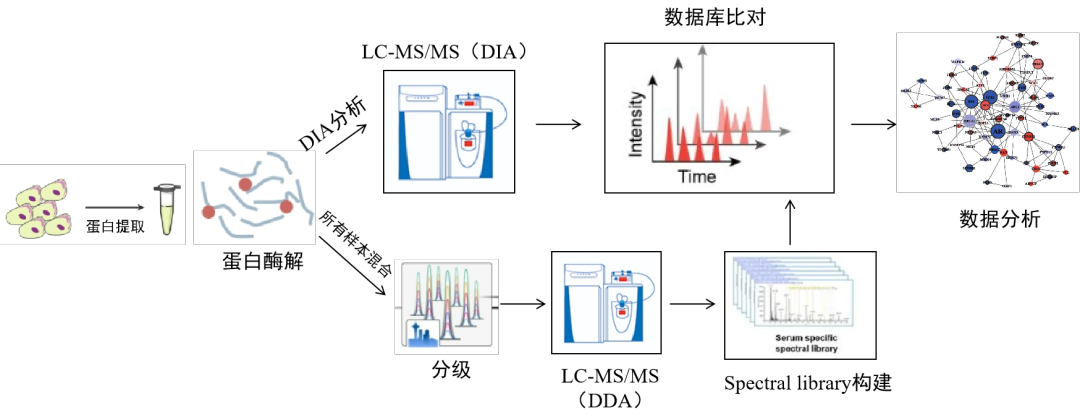 DIA(data-independent acquisition)蛋白质组学利用基于数据非依赖采集模式的质谱技术进行蛋白质组学研究,可对复杂的、大规模的蛋白样本进行高分辨率和高灵敏度的精确定量鉴定,融合了传统蛋白质组学“鸟枪法”(shotgun)和质谱绝对定量“金标准”选择反应监测/ 多反应监测(SRM/MRM)技术的优势和特点。DIA在一级质谱检测后,会对特定质荷比范围内的所有母离子进行碎裂,采集所有母离子的碎片离子,并快速地依次扫描相邻的母离子宽口内的所有碎片离子,从而获得完整的肽段信息,大大提高蛋白定量的可重现性。