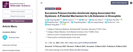 10.《多糖结构与活性研究范例:蛋白组与微生物组联合揭示杜仲多糖延长果蝇寿命的分子机制》