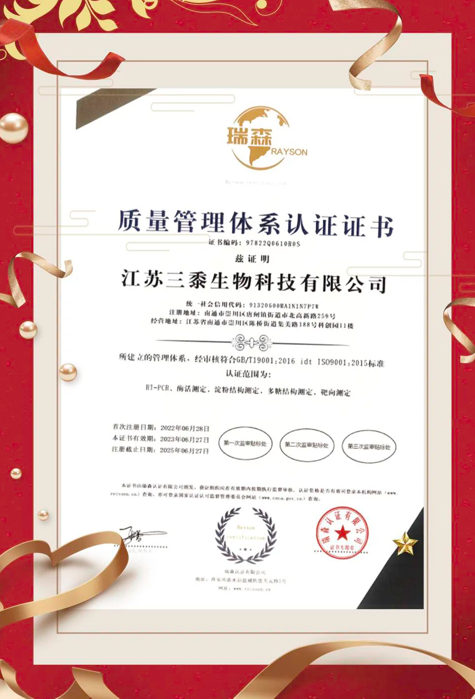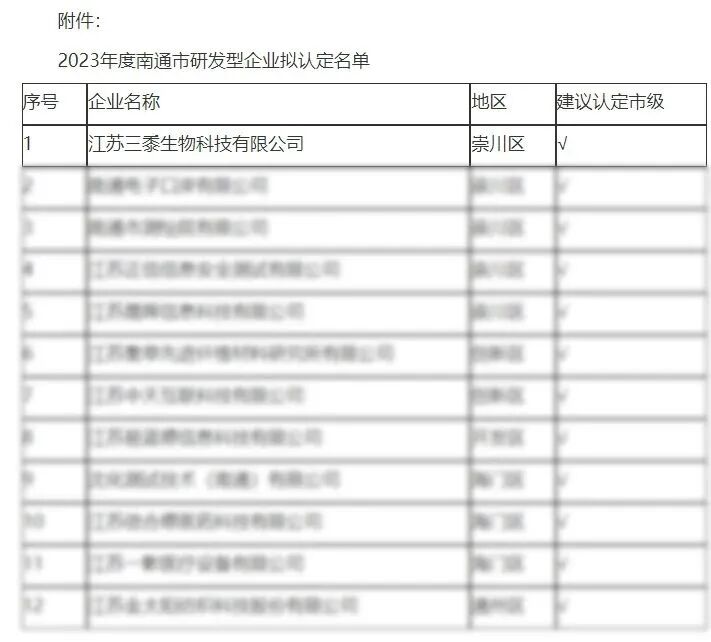 三黍生物入选2023年度南通市研发型企业拟认定名单