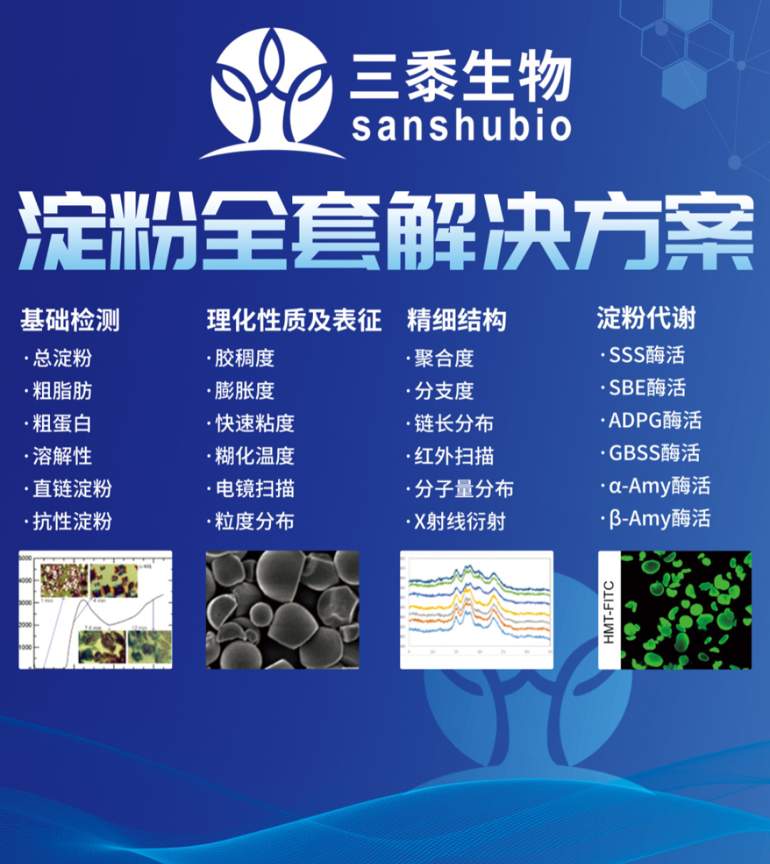 随着淀粉应用行业的发展,各行业的淀粉研究单位越来越关注淀粉性质与结构之间的相互关系,因此,公司在现有淀粉结构特性、表征特性及理化特性体系的基础上进一步推出工业应用型指标检测服务,包括淀粉白度、淀粉冻融稳定性、淀粉透明度等指标,就此完全打通淀粉研究上下游,从淀粉合成和降解代谢、基础特性、理化特性、结构特性、表观形貌及应用特性全方位分析淀粉品质、结构及应用,建立国内最完善、全方位的淀粉研究平台。
