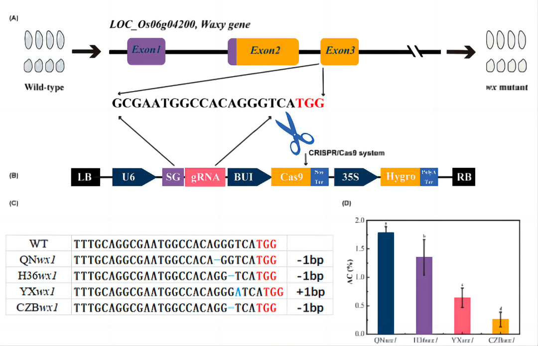 蜡质水稻缺乏直链淀粉,是水稻的一个重要变种,其淀粉已被广泛使用。本文介绍了通过CRISPR/Cas9基因编辑系统生成的蜡质水稻新品种。本文通过CRISPR/Cas9编辑Waxy(Wx)基因,成功获得了四种不同理化性质的蜡质水稻淀粉。结果表明,Wx突变体淀粉的直链淀粉含量(AC)从0.26%到1.78%不等,而在所有Wx突变体中,CZBwx1淀粉的凝胶稠度最好,水溶性最高。Wxb等位基因突变体比Wxa等位基因突变体产生更多的短链(链聚合度(DP)6-11)和更少的中长链(DP12-70),而Wxa等位基因突变体的AC则高于Wxb等位基因突变体。wxa突变体淀粉的糊化温度(GT)高于wxb突变体淀粉。此外,我们还发现,Wx基因编辑后,蜡质水稻淀粉的GT和直链淀粉的精细结构类型没有发生变化。基于这些发现,我们有可能制备出具有不同理化性质的蜡质水稻淀粉,其中包含目标 GT 和链长分布的直链淀粉。