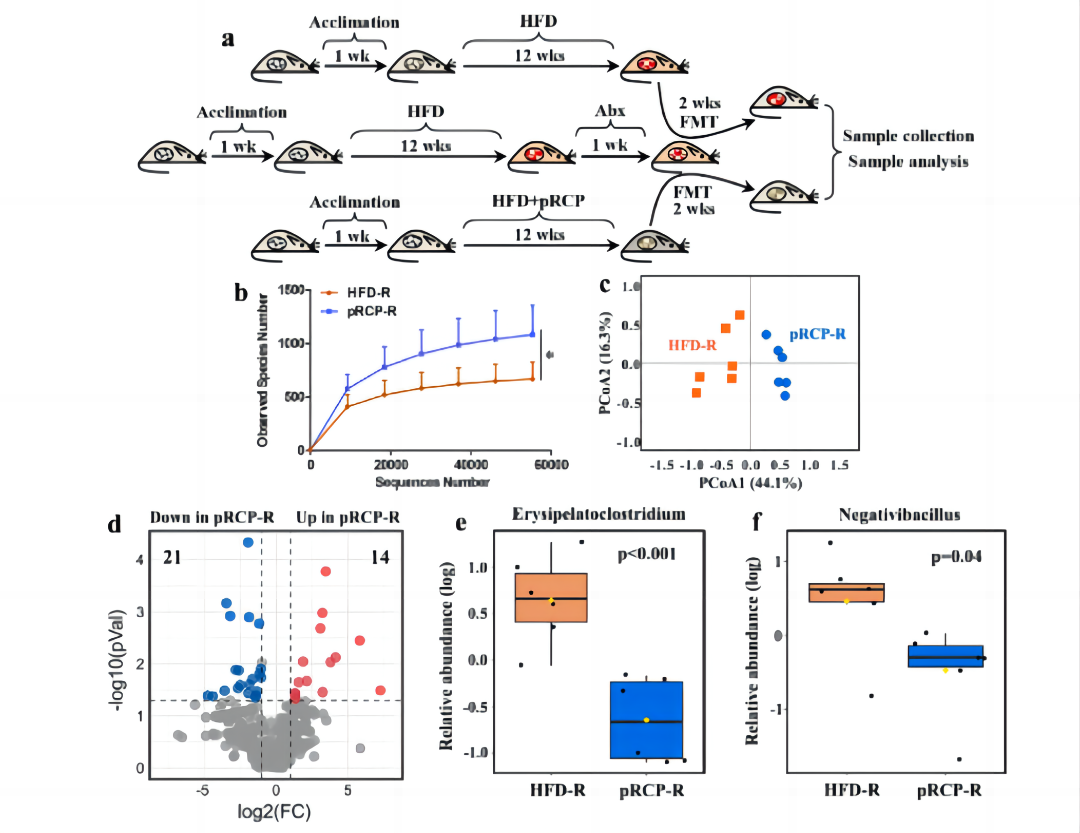 树莓被用作药食同源物种,其多糖值得研究和开发。本研究从未成熟的覆盆子果实中提取并鉴定了一种新型多糖(pRCP)。结果表明,pRCP 是一种酸性杂多糖,其 Mw 值为 74.86 kDa,具有较高的均一性。pRCP 的主链由 → 3,6)-β-Galp(1 → 和 → 5)-α-Araf(1→ 组成,其侧链由α-Araf(1→)组成。侧链由连接到 → 3,6)-β-Galp(1 → 的 C3 位置的 α-Araf(1 → 组成。此外,补充 pRCP 还能增加高脂饮食(HFD)喂养小鼠的肠道微生物多样性并减少有害细菌,包括红细胞梭状芽孢杆菌(Erysipelatoclostridium)和阴沟杆菌(Negativibacillus)。用 pRCP 治疗还能减轻高脂饮食诱导的小鼠结肠炎症和氧化应激。这些有益作用可通过粪便微生物小鼠。因此,我们的研究表明,pRCP 可作为一种潜在的益生元,通过调节肠道微生物群来改善肠道健康。