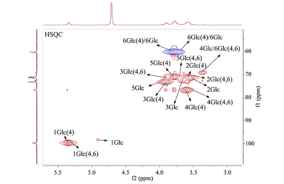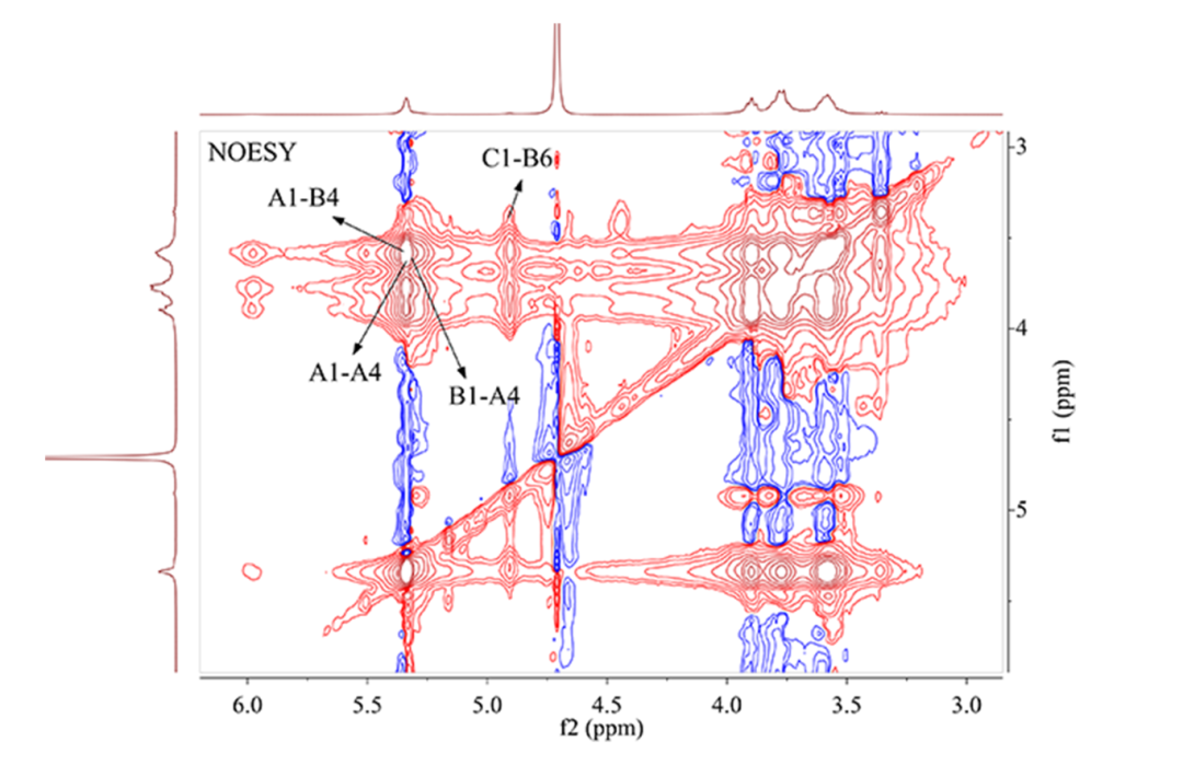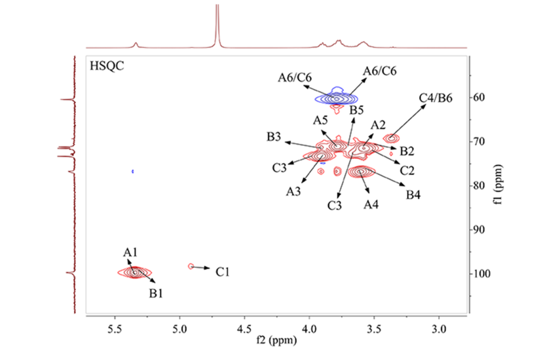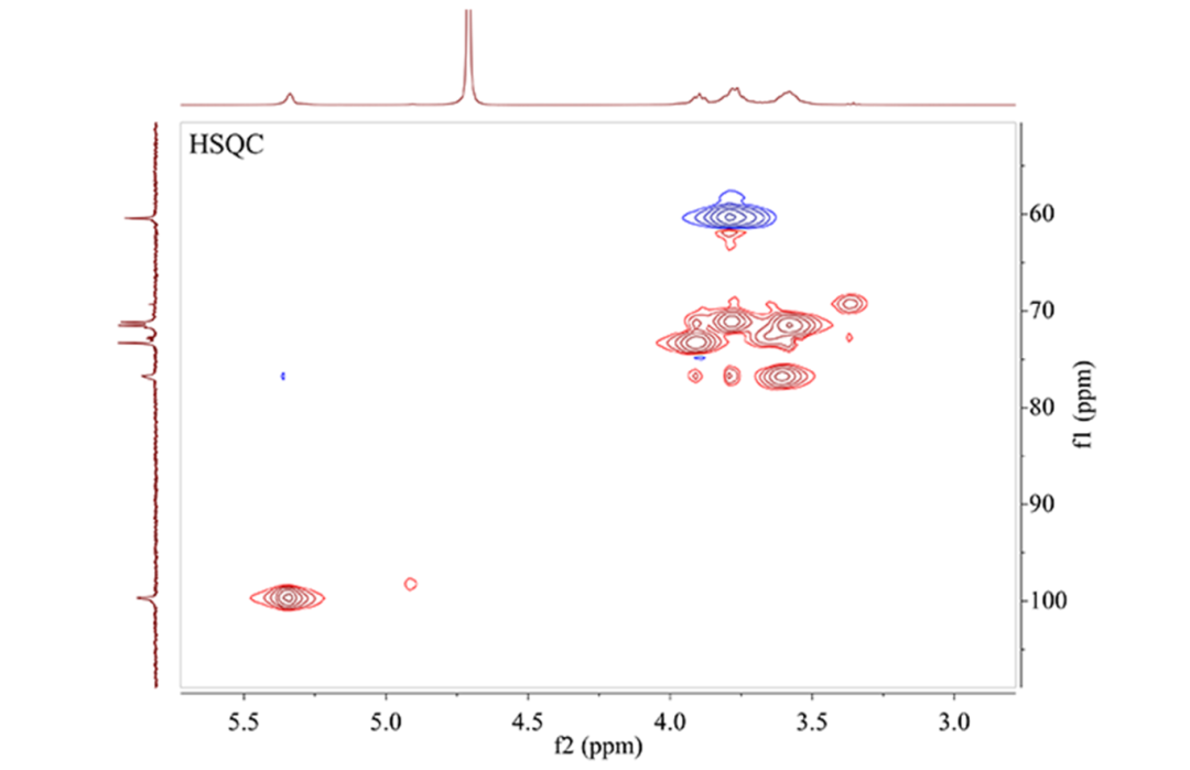 多糖具有多种生物活性,而多糖的结构是影响其生物活性的关键因素。近几十年来多糖研究已经取得极大进步,但是受多糖分离纯化及其结构复杂性的限制,其结构分析一直是多糖研究中的难题,核磁作为研究结构经典的手段之一在多糖结构解析中起到关键作用,通过一维1H NMR和13C NMR谱可得到其整体结构信息,二维NMR谱则能给出相关碳氢连接方式方面的信息。