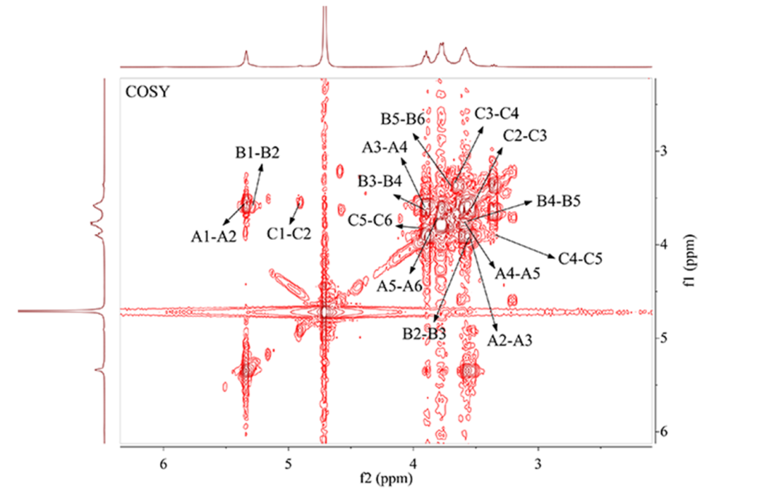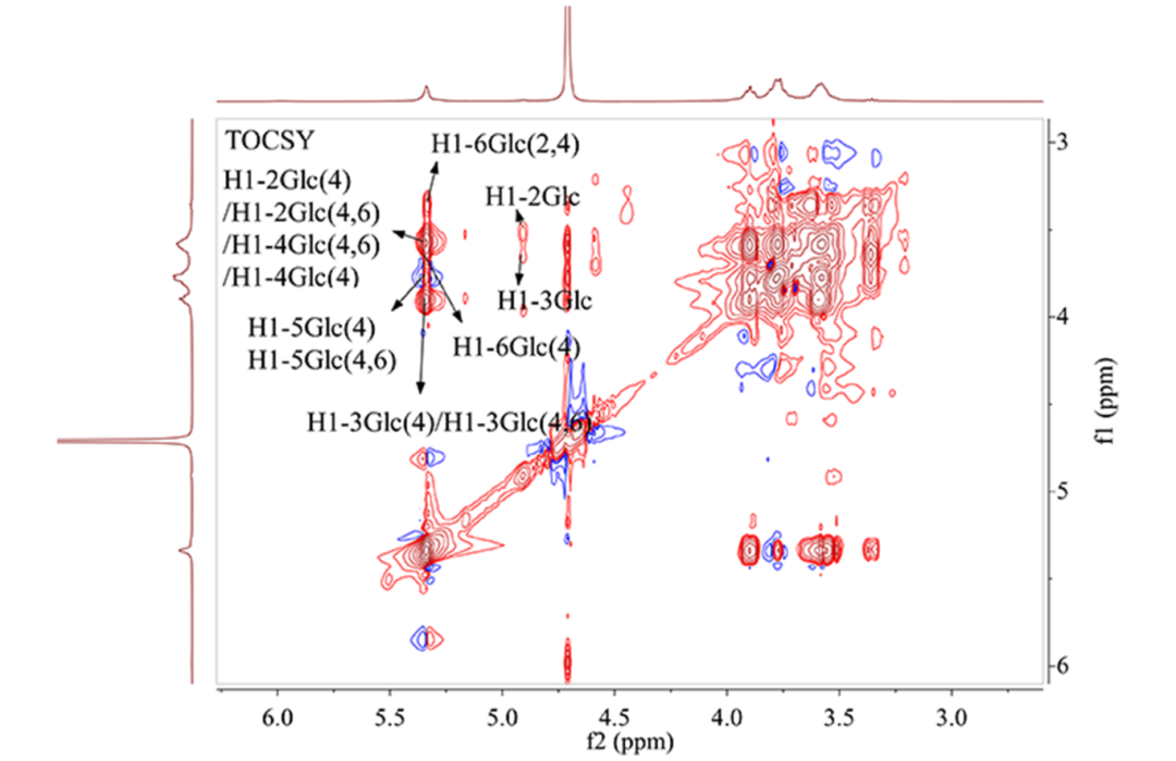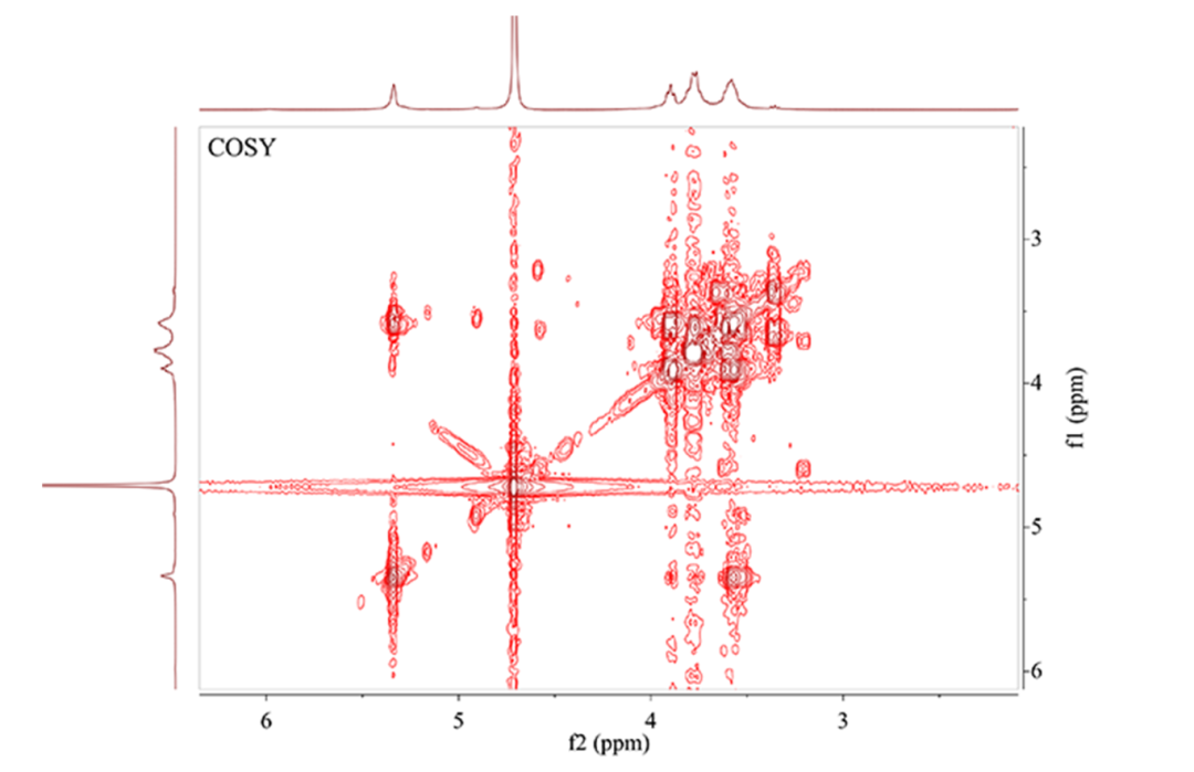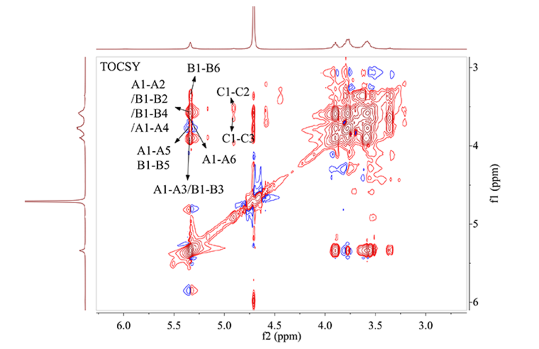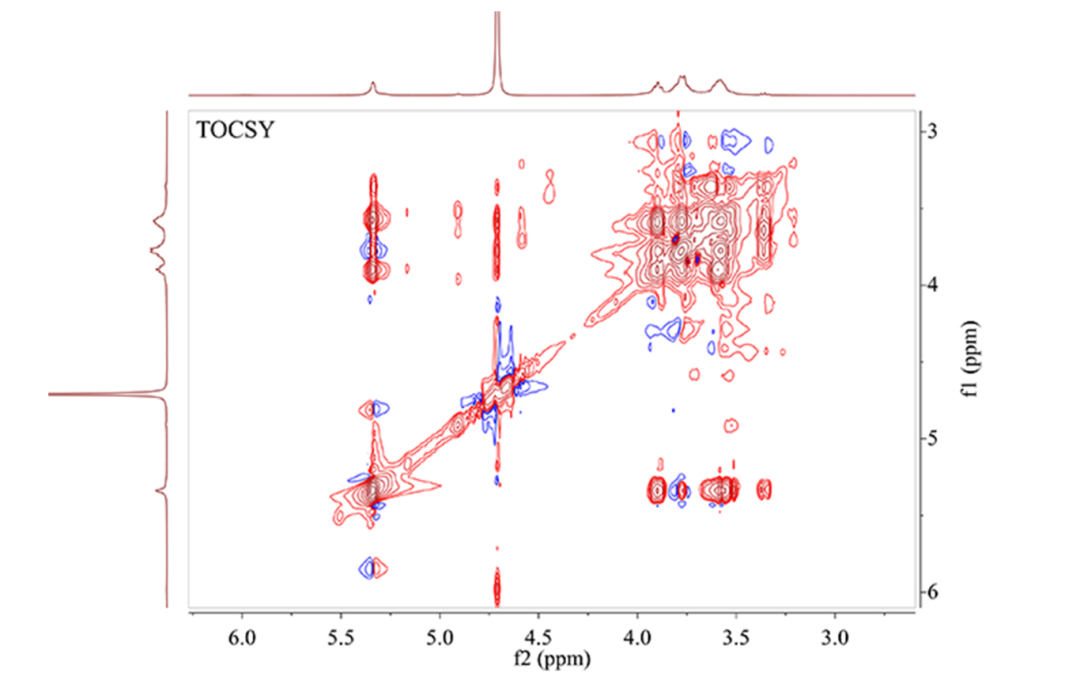 总相关谱TOCSY是一个典型的同核二维谱图。该实验即是利用自旋锁定过程中的等频混合条件,使完整耦合自旋链上的所有氢原子核间产生交叉峰,从而进行结构鉴定,非常适合解析复杂偶合体系。结合COSY共同分析,对复杂的重叠谱图进行解析,从端基质子出发,逐个解析出与其耦合的质子,进一步确认COSY图谱分析的准确性。