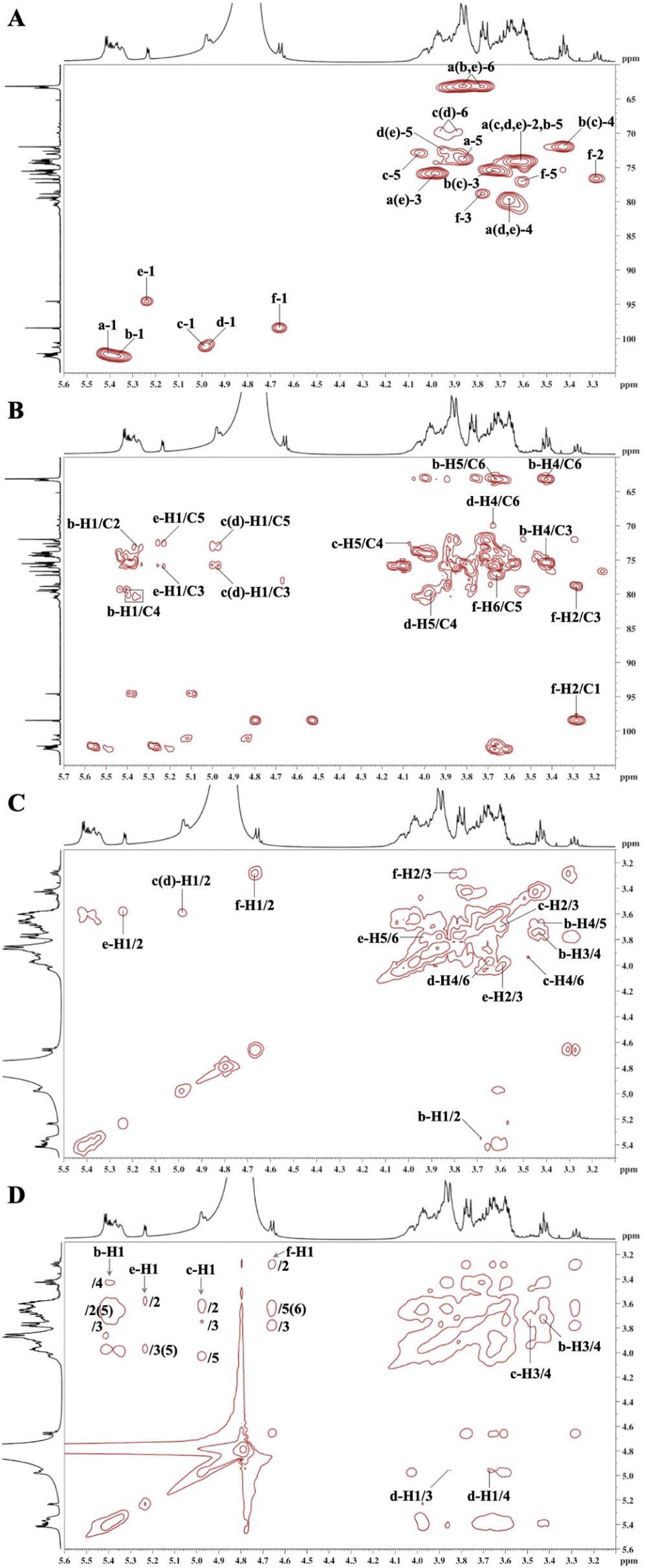 图14 (A) HSQC, (B) HMBC,(C) 1H-1H COSY,(D) TOCSY