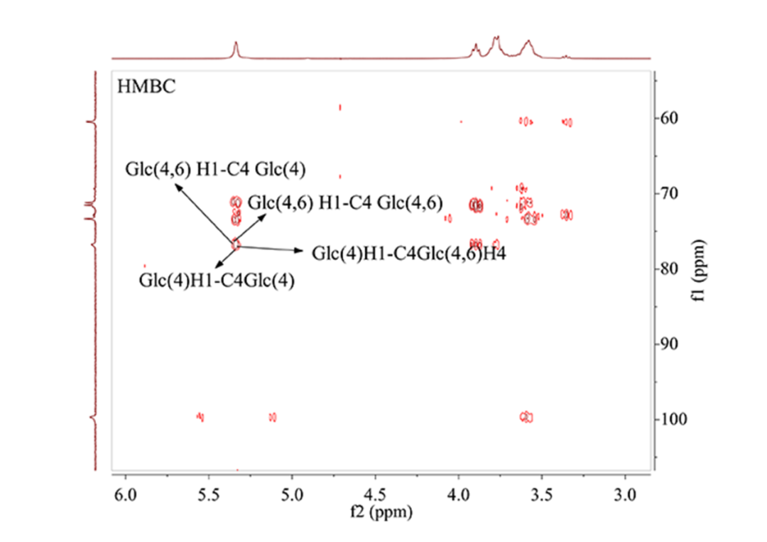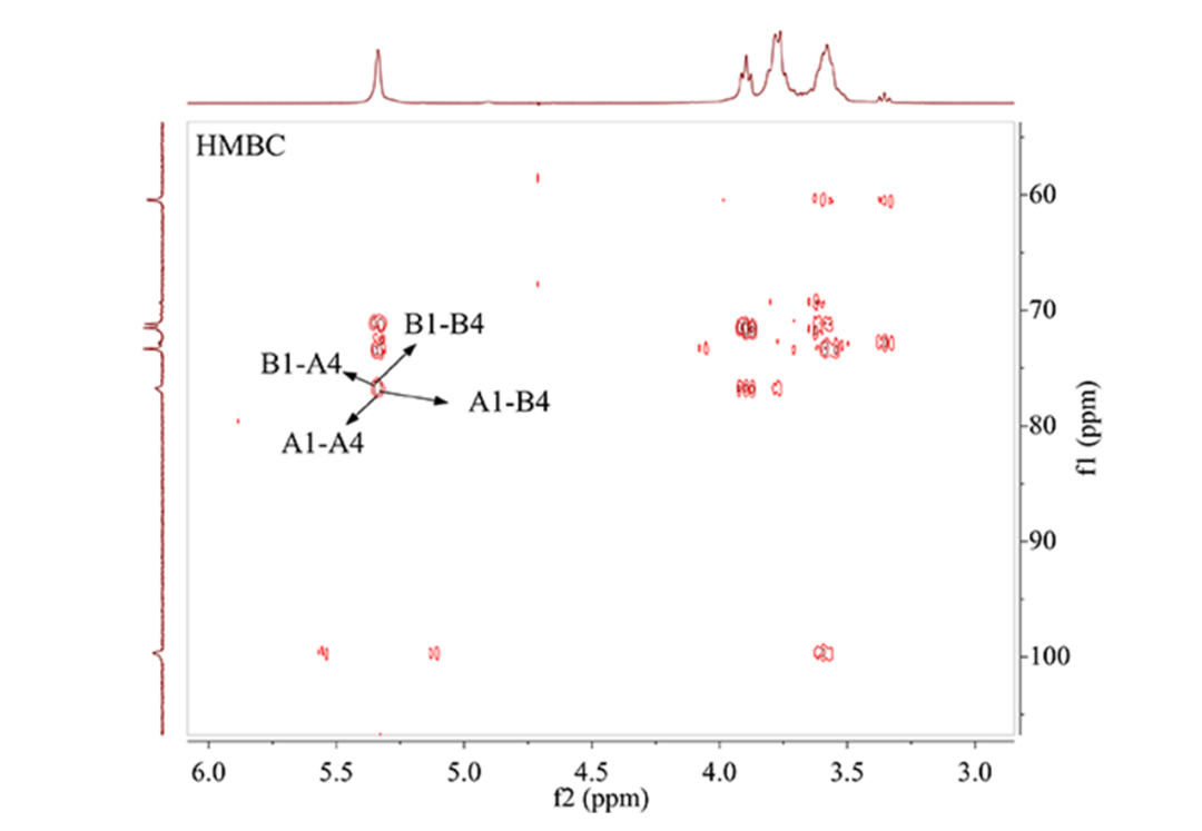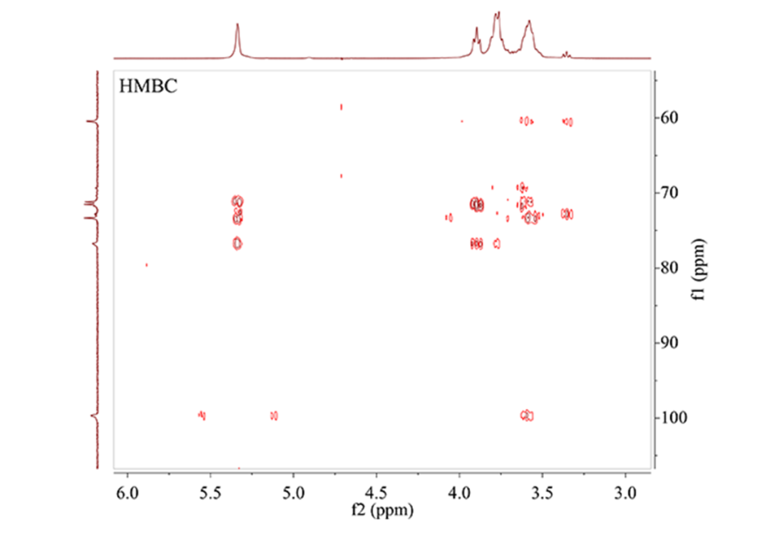 HMBC谱是C-H 异核多键相关谱。HMBC可高灵敏地检测碳与氢的远程偶合信号,即相邻两个糖残基之间的C与H的偶合。通过异头氢(碳)与另一糖残基相连的碳(氢)偶合,推断单糖残基间的连接片段和顺序。