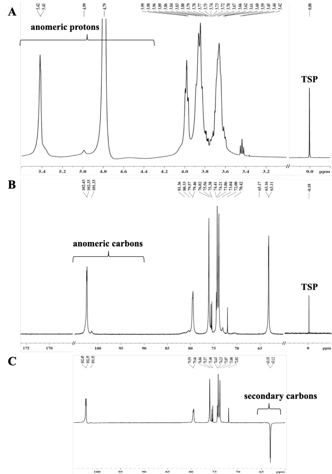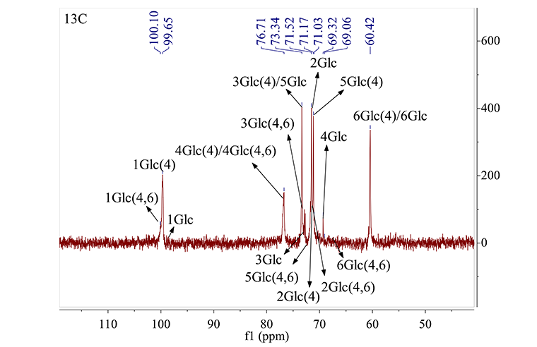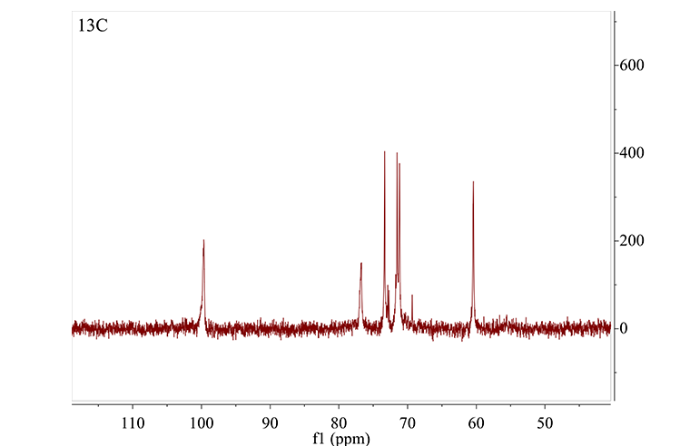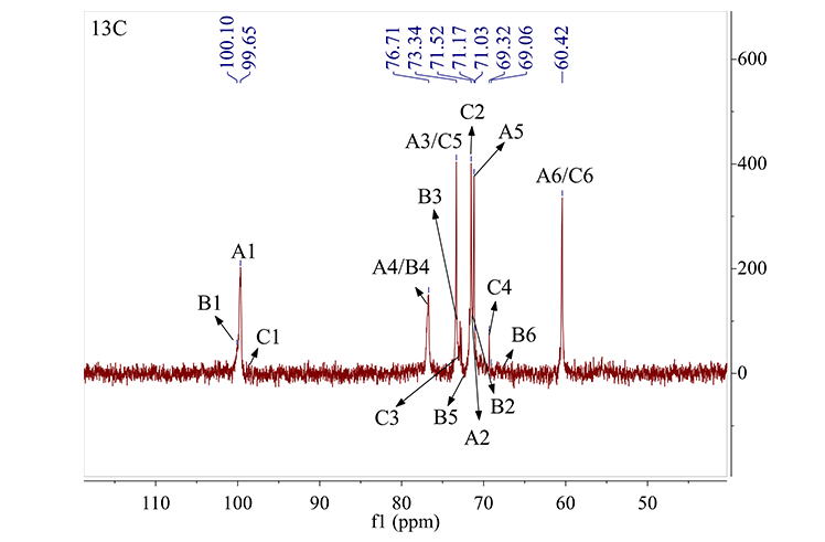 与1H NMR相比,多糖在13C NMR中的化学位移信号分布较宽。谱线重叠少,可以提供糖残基信息(多糖在13C NMR中的异头碳信号集中于95-110ppm), 确定糖链的连接位置和某些特定基团 (如 δ 170~176 范 围 的 己 糖 醛 酸 的 羧 基 或 乙 酰 氨 基 信号)。