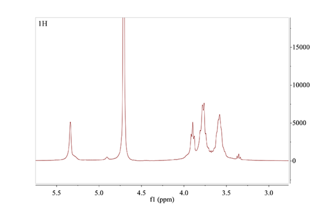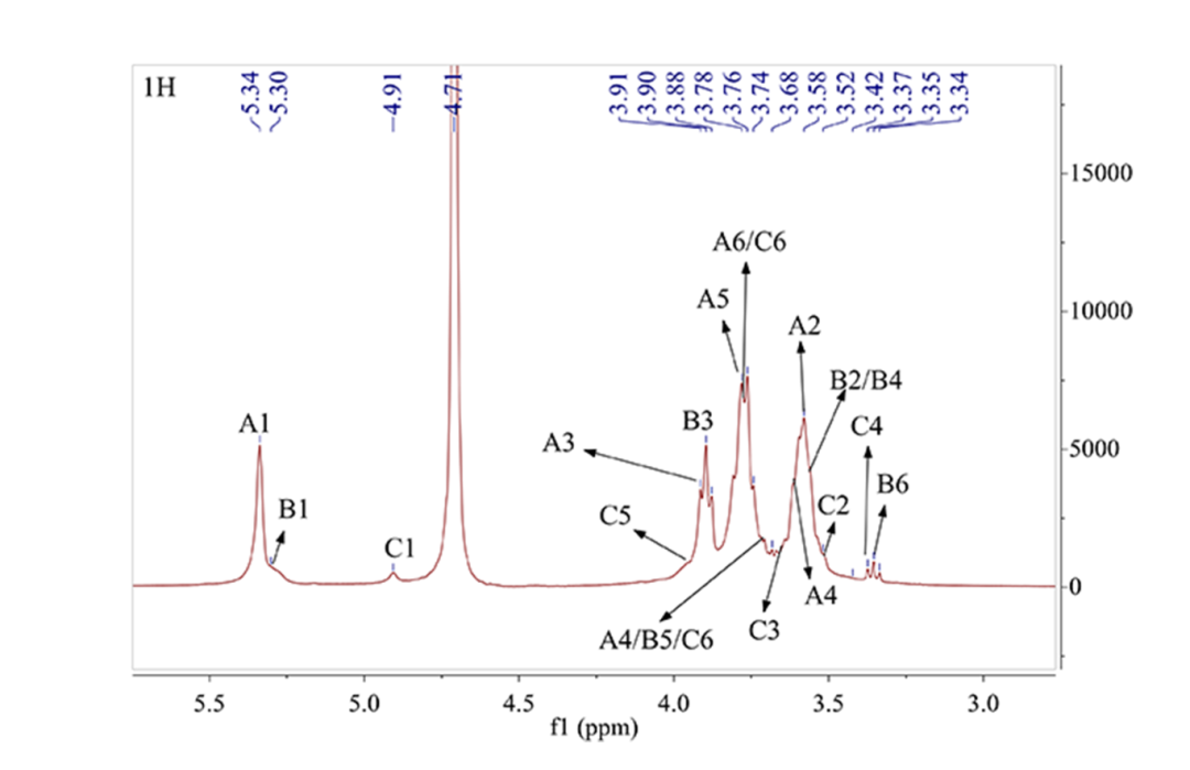 一维氢谱主要解决多糖结构中糖苷键的构型问题。多糖在1H NMR中的信号集中于3~6 ppm。通常β-糖苷键构型的异头氢信号主要分布在δ 4.3~4.9 ppm,α-糖苷键构型的异头氢信号主要分布在δ 4.9~5.8 ppm。