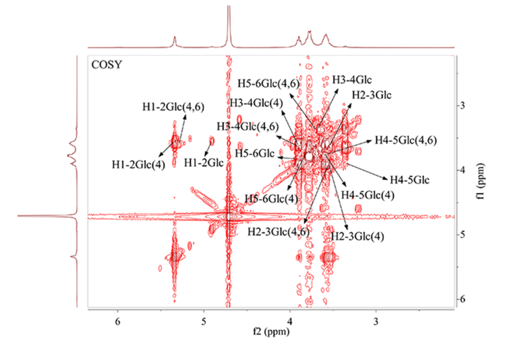 氢-氢相关谱(COSY)是最常用的同核位移相关谱。一般反映的是邻碳氢的偶合关系,从而可知同一自旋体系里质子之间的偶合关系,是归属谱线、推导结构强有力的工具。同一糖残基的1H信号将在对角线上相交,交点称对角峰(diagonal peak)。图上对角线两侧呈对称分布的两个点叫相关峰 (cross peak,或correlation peak)。相互偶合的两个/组1H信号将在相关峰上相交,主要解析的是相邻或相间质子氢相关信号。