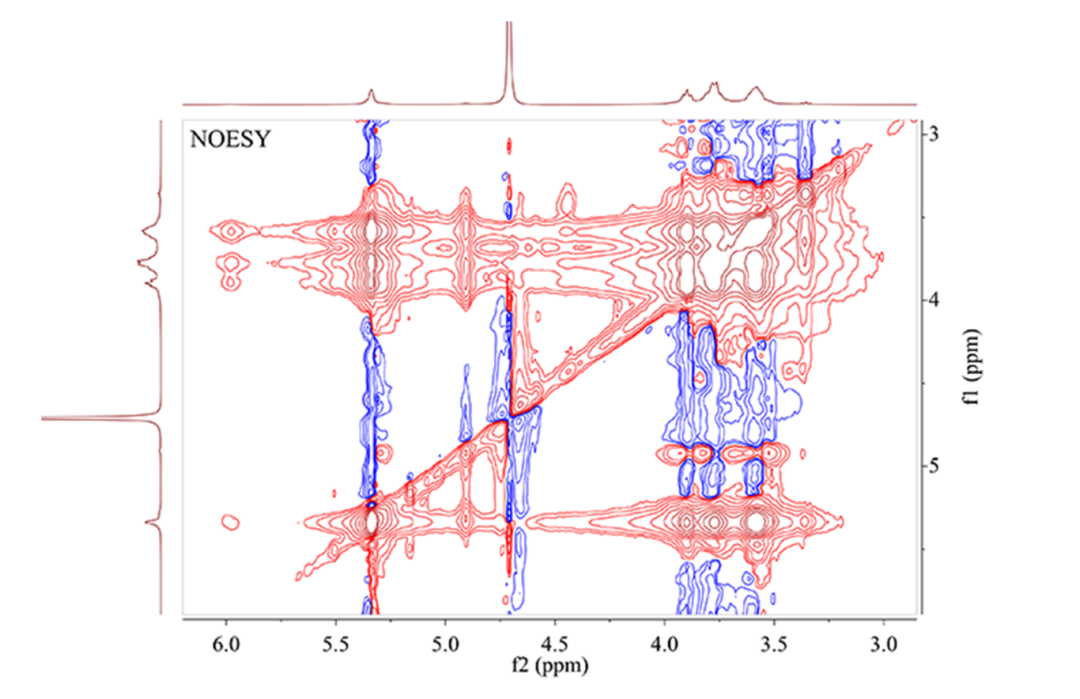 NOESY属NOE类的二维核磁共振谱。NOE主要用来确定两个质子在分子立体空间结构中是否距离相近,若存在NOE则表示两者接近,NOE值越大,则两者在空间的距离就越近。NOE对确定有机化合物的结构、构型和构象具有重要作用。