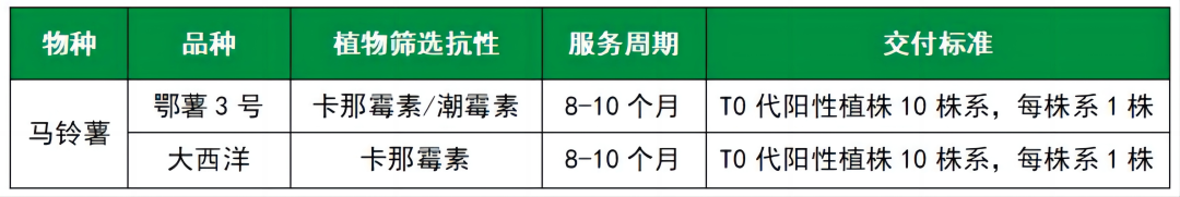 马铃薯(学名:Solanum tuberosum L.),属茄科一年生草本植物,块茎可供食用,是全球第四大重要的粮食作物,仅次于小麦、稻谷和玉米。原产于南美洲安第斯山区,人工栽培历史最早可追溯到大约公元前8000年到5000年的秘鲁南部地区。中国是世界马铃薯总产最多的国家。2015年,中国启动马铃薯主粮化战略,将成稻米、小麦 、玉米外的又一主粮。公司基于微型薯浸染法进行马铃薯的遗传转化操作,效率高,体系稳定。