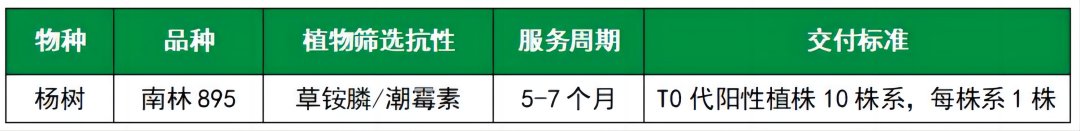 杨树(PopulusL.)是杨属的植物,全属有约100多种,我国约62种(包括6杂交种),其中分布中国的有57种,引入栽培的约4种,此外还有很多变种、变型和引种的品系。杨树作为林业研究方向的“模式植物”,在植物生物质积累、细胞壁合成、造纸、营养物质长距离运输等方向具有重要的意义。公司提供杨树的遗传转化服务。